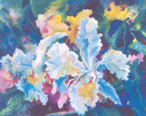 「翅の生えた花、水底に漂う花、夢想する花など、 イメージとしての幻想の花に私の感性を表現できればと思っています。 最近は自作の具象抽象の絵画に合わせて、ピアノによる弾き語りをして 発表するという試みもしています。」武藤直美氏。