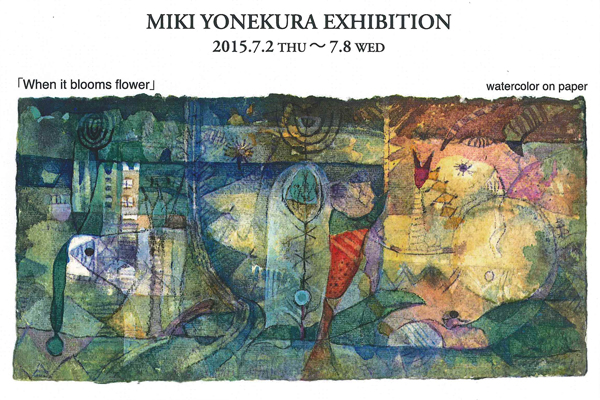 「紙に透明水彩絵の具、ナチュラルな透明色だけにこだわり、 みずみずしい色彩、詩的なかたちの平面構成で『心象風景』を描いてきました。 最近作は今まで蓄積してきた水彩の技術と蜜蝋を融合させ 心の中の記憶の(風景、植物、生物)などを構成し抽象と具象の融合。 画面の色彩も明るく自由で楽しい詩的な絵画空間を 表現したいと思いました。」 米倉三貴氏。