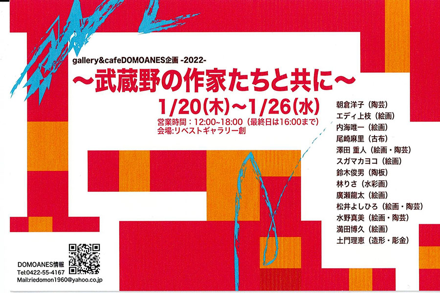 朝倉洋子(陶芸) エディ上枝(絵画) 内海唯一(絵画) 尾崎麻里(古布) 澤田重人(絵画・陶芸) スガマカヨコ(絵画) 鈴木俊男(陶板) 林りさ(水彩画) 広瀬龍太(絵画) 松井よしひろ(絵画・陶芸) 水野真美(絵画・陶芸) 満田博久(絵画) 土門理恵(造形・彫金)